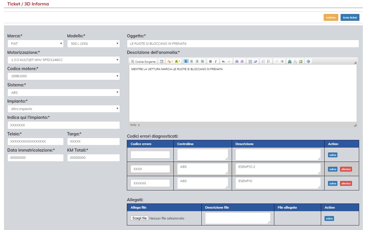Si ricorda che è opportuno specificare tutti i dati del mezzo per permettere una celere risoluzione da parte dei nostri tecnici affinché si possa accedere alla maggior parte di informazioni necessarie.